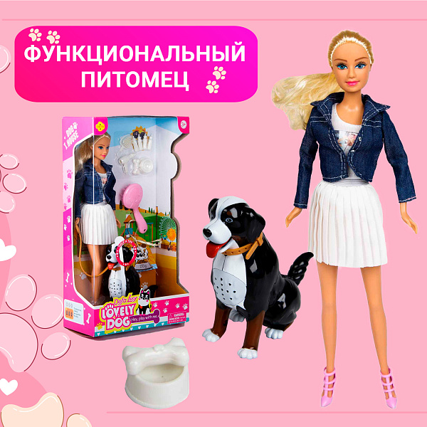 Кукла Lucy с верным питомцем станет лучшей подругой для девочки. В игровой набор входит кукла с подвижными ногами и руками, собака и аксессуары для ухода за животным: расческа, корм с косточкой, фен и бутылочки для кормления. Питомец работает от батареек и может издавать звуки, двигать хвостиком и язычком.