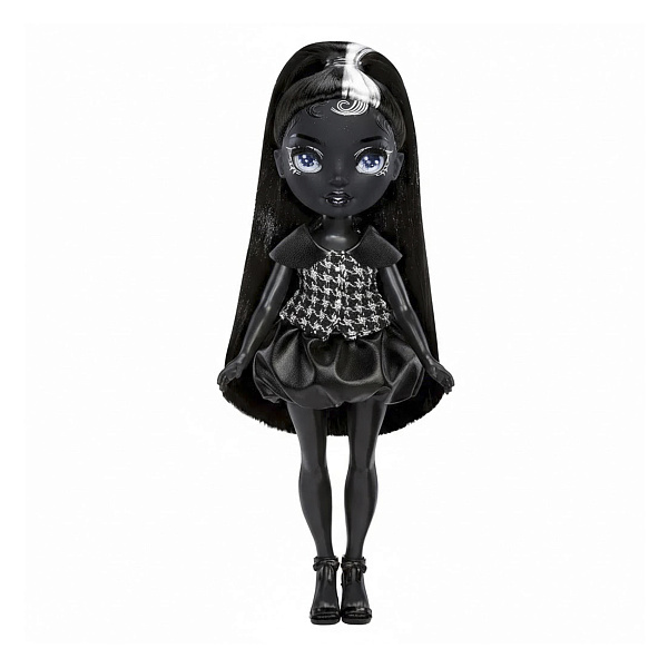 Кукла Шанель Оникс из серии Shadow High высотой 27 см одета в элегантный чёрный наряд с текстурным декором и дополнена маленькой сумочкой. Её тёмные волосы, выразительные глаза и акцентный макияж подчеркивают её загадочный и роскошный образ, соответствующий стилю коллекции.