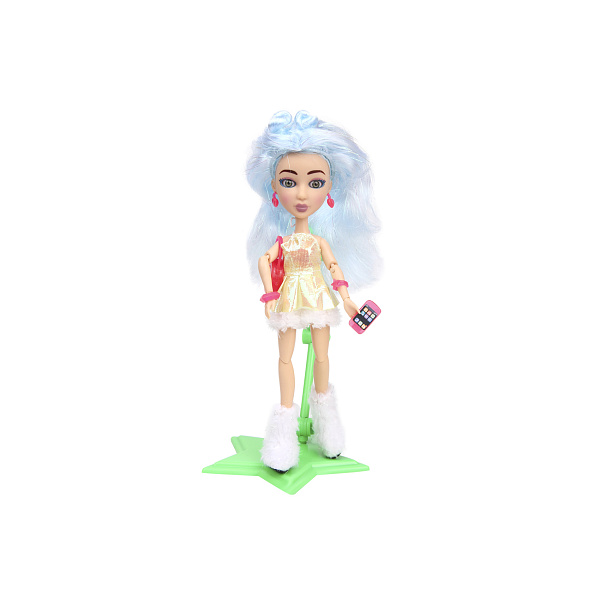 Кукла-модель ECHO имитирует стильную блондинку из мира высокой моды. Пышные светлые волосы ниспадают на плечи, одета девушка в короткое золотистое платье, декором розового цвета. Помимо куклы в наборе представлены аксессуары, зеленая подставка-подиум, фон хромакей для фотографирования. Голова, руки и ноги вращаются на шарнирах.