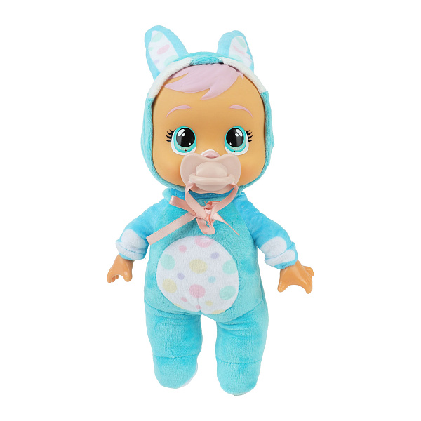 У малышки яркий голубой костюм с длинными ушками на капюшоне. В комплект входит соска розового цвета, которая поможет успокоить малышку.