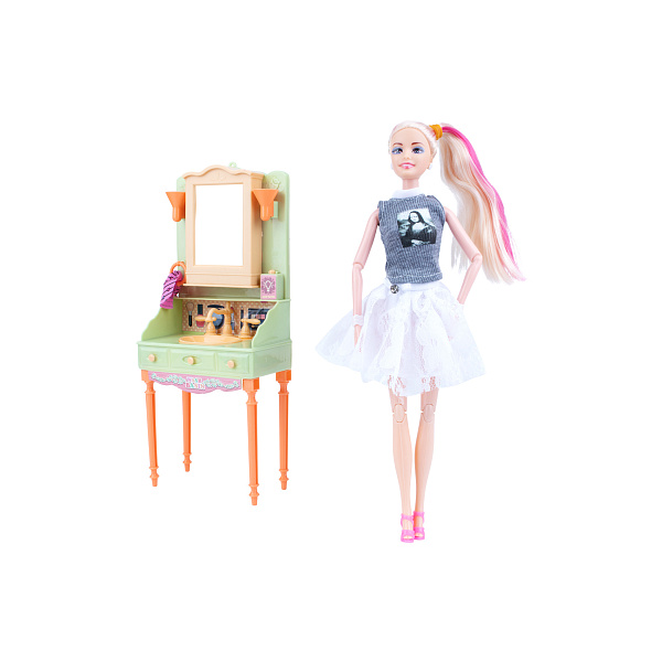 Эта стильная кукла с длинные локонами одета в белое платье и безрукавку с принтом» по центру. Волосы оттенка блонд с розовой вставкой и желтой резинкой завершают образ. Вместе с куклой в набор входит столик стилиста, расческа и пара розовых туфель.