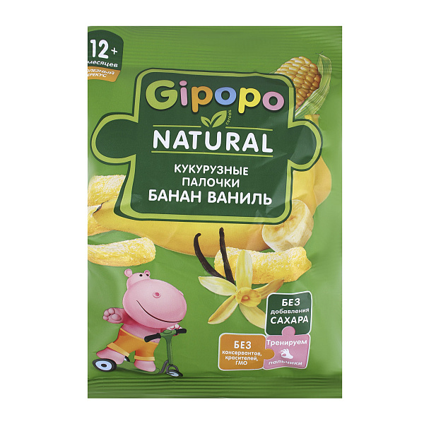 Кукурузные палочки «Гипопо» с бананом и ванилью созданы для детей с 12 месяцев. Эти воздушные и хрустящие палочки станут отличным перекусом для малыша благодаря их нежному вкусу и легкой текстуре.