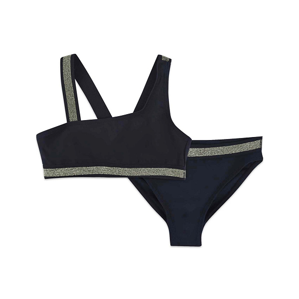 Купальник выполнен минималистично и единственный декор – золотые полосы на топе и трусиках. Они придают изящности в образ юной модницы.
