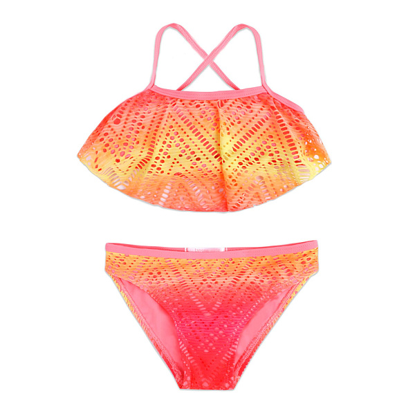 Яркий купальник будет одобрен любой девочкой. Он оформлен в сочной цветовой гамме, идеально подходит для активного отдыха. Модель декорирована ажурным полотном. Верхняя часть удерживается при помощи узких лямок. Они перекрещиваются на спине ребенка, не сползают с плеч. Трусы классической формы снабжены эластичной резинкой на поясе. Она не оказывает лишнего давления на внутренние органы, не врезается в кожу.