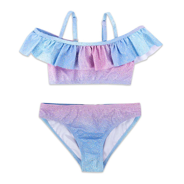 Детский раздельный купальник для девочек с блестками. В комплект входят плавки с классической посадкой и лиф на тонких лямках и с декоративной оборкой на груди. У модели красивый цвет с градиентом от голубого к сиреневому. Помимо необычного оттенка, ткань привлекает к себе внимание благодаря переливающимся блестками, похожим на маленькие рыбьи чешуйки. В таком эффектном купальнике девочка почувствует себя настоящей русалочкой.
