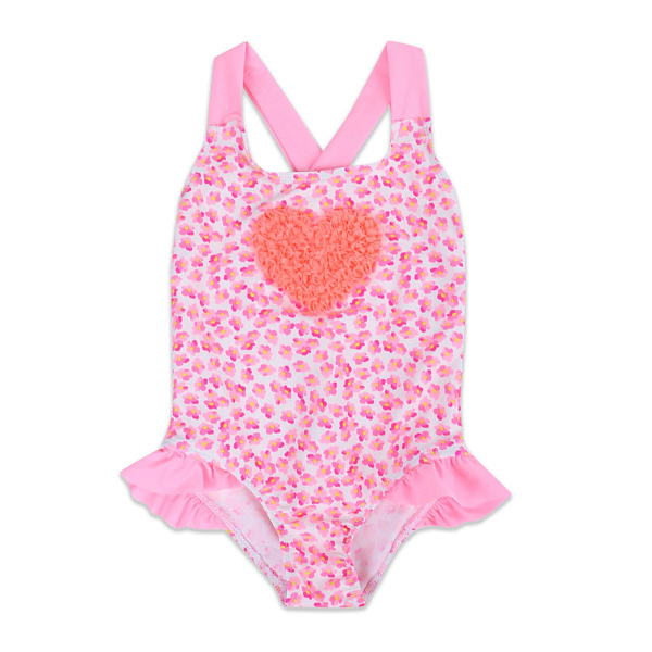 Слитный купальник полностью соответствует базовым потребностям девочки. Модель оформлена в нежной цветовой гамме, украшена объемной аппликацией в форме сердца. Оригинальный крой гарантирует комфортную посадку на фигуре любого типа. Широкие лямки перекрещиваются на спине, не сползают во время активных игр. Малышка по достоинству оценит однотонные оборки по бокам, придающие изделию стильный вид.