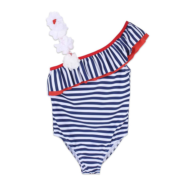 Слитный купальник для девочек выполнен в стильном морском дизайне, сочетающем синие и белые полоски. Такой рисунок всегда актуален для пляжного отдыха. Красная окантовка и украшение в виде оборки на плече добавляют яркий акцент, создавая игривый и модный образ.