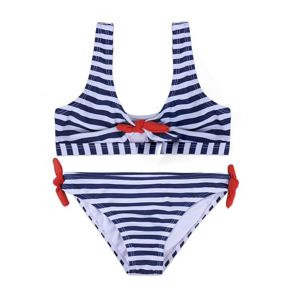 Раздельный купальник для девочек выполнен в классическом морском стиле с синими и белыми полосками. Яркие красные бантики на трусиках и лифе добавляют веселые акценты, создавая привлекательный и стильный образ.