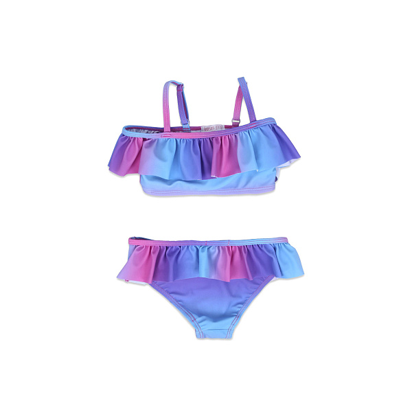 Романтичный и нежный раздельный купальник для девочек с оборками на лифе и трусиках. Благодаря рюшам образ выглядит очень мило, как будто на девочке комплект одежды из юбки и топика. Для купальника использовалась синтетическая ткань (85% полиэстер, 15% эластан). Она эластичная, хорошо тянется, не давит и не ограничивает движения во время плаванья. После купания быстро высыхает.