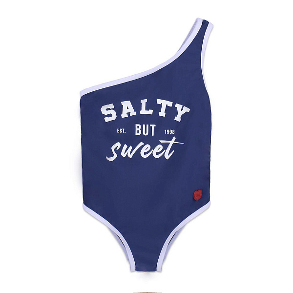 Купальник привлекает внимание насыщенным синим цветом и оригинальным принтом с надписью. Конструкция с одной лямкой придает изделию современный облик, а белая окантовка добавляет контраст и завершает образ. Благодаря эластичности материала купальник плотно облегает тело, не стесняя движений и обеспечивая свободу и комфорт во время плавания.