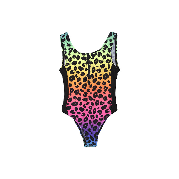 Купальник с анималистичным принтом, нанесенным на яркий разноцветный фон. По бокам вшиты контрастные черные вставки, а на груди - пластиковая декоративная молния. Модель современная и стильная. В таком купальнике маленькая модница будет чувствовать себя уверенно и с легкостью освоит плавание или другие водные виды спорта.