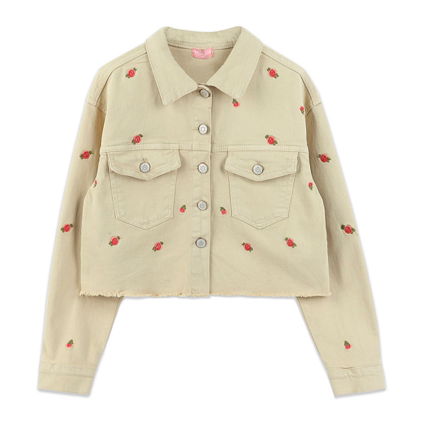 Детская куртка изготовлена из хлопка (98%) с добавлением эластана (2%), что обеспечивает высокий уровень комфорта и свободу движений. Куртка выполнена в нежном бежевом цвете с изящной вышивкой в виде маленьких красных цветочков, добавляющим изделию игривости и стиля. Модель с классическим воротником, длинными рукавами и удобной пуговичной застежкой спереди. На груди расположены два накладных кармана.