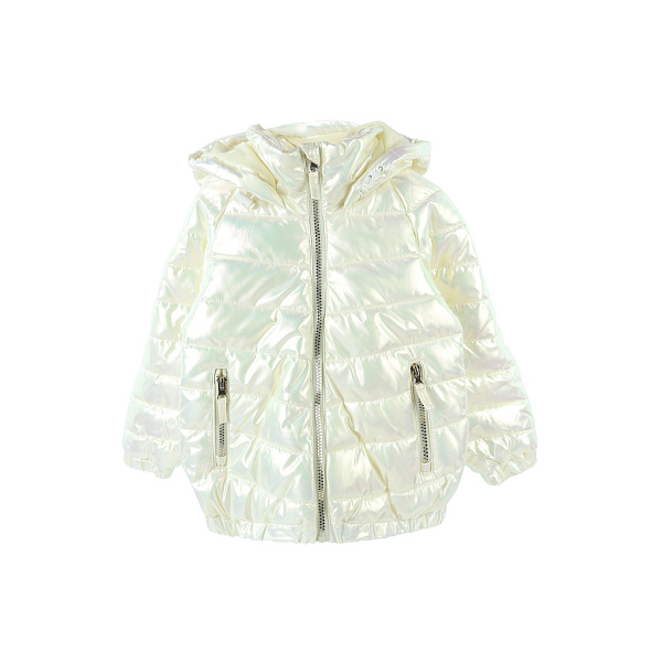 Демисезонная куртка для девочек с необычным голографическим эффектом. У модели удлиненная спинка, прикрывающая поясницу и попу ребенка. Большой капюшон поможет защитить девочку от ветра и дождя. На рукавах и внизу вшита резинка, обеспечивающая дополнительную защиту от холода. Внутри теплый синтетический наполнитель.