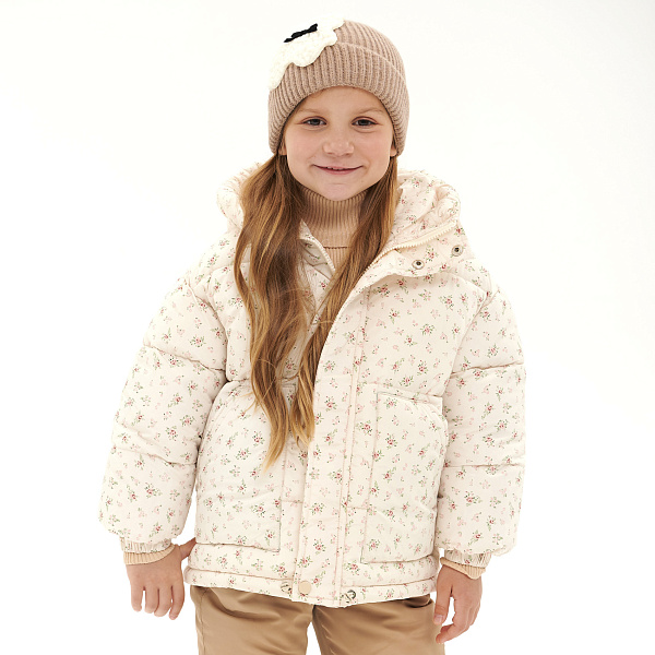 Нежная демисезонная куртка для девочки выполнена в светлом оттенке с изящным мелким цветочным принтом, который придаёт изделию очарование и лёгкость. Модель имеет прямой крой, удобный капюшон и эластичные манжеты на рукавах, обеспечивающие дополнительную защиту от ветра. Застёжка на молнию закрывается планкой с кнопками, а два вместительных кармана добавляют практичности.
