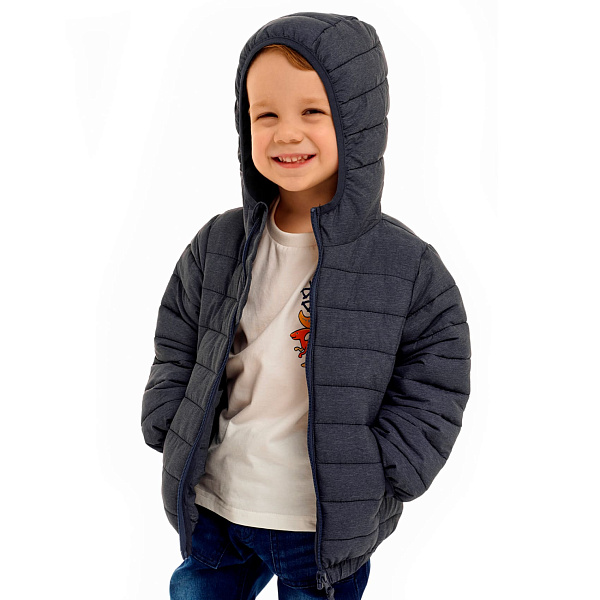 Демисезонная куртка для мальчиков с синтетическим наполнителем (верх – 72% нейлон, 28% полиэстер; подкладка и наполнитель – 100% полиэстер). Верх обладает высокими показателями водонепроницаемости, благодаря чему в ней можно не бояться дождя. Капюшон на спине защитит не только от воды, но и от ветра. Изделие застегивается на молнию. На поясе пришита резинка.