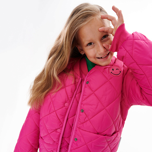 Стеганая демисезонная куртка выполнена из ярко-розового нейлона с веселым смайликом, добавляющим стиль и радость. Нейлон обладает отличными водоотталкивающими свойствами, что защитит от внезапного дождя. Кроме того, этот материал эффективно защищает от ветра. Куртка застегивается на кнопки, что обеспечивает удобное и быстрое снятие и надевание.
