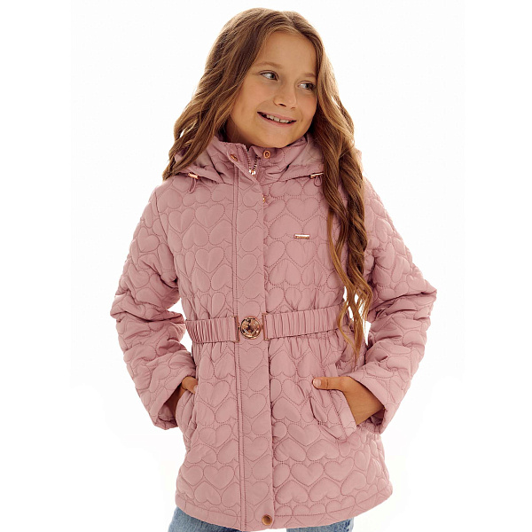 У ветровки объемный узор в форме мягких сердец. Ткань приятного пепельно-розового оттенка. Крой прямой. Спинка удлиненная, прикрывающая попу. Куртка застегивается на молнию и дополнительно подвязывается ремнем на специальном замке в виде сердечка. По бокам куртки два вместительных кармана для перчаток и других мелких вещей.