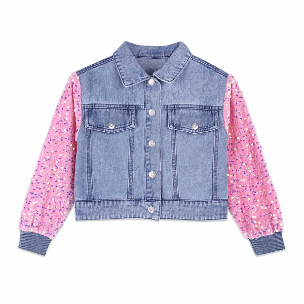 Джинсовая куртка для детей с розовыми бархатными рукавами сочетает в себе оригинальный стиль и практичность. Основа куртки выполнена из хлопка джинсового цвета, обеспечивая износостойкость и устойчивость к стирке. Рукава изготовлены из мягкого полиэстера с нежной велюровой текстурой и ярким розовым цветом, украшенным блестками, добавляя нарядности и игривости изделию.