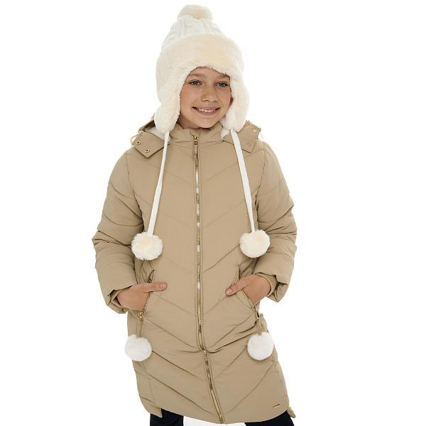 Представляем вашему вниманию модель красивой и утеплённой зимней куртки для девочки. Она выполнена в пастельном бежевом цвете, дополнена металлической фурнитурой и контрастными брелоками на бегунках в белом цвете.