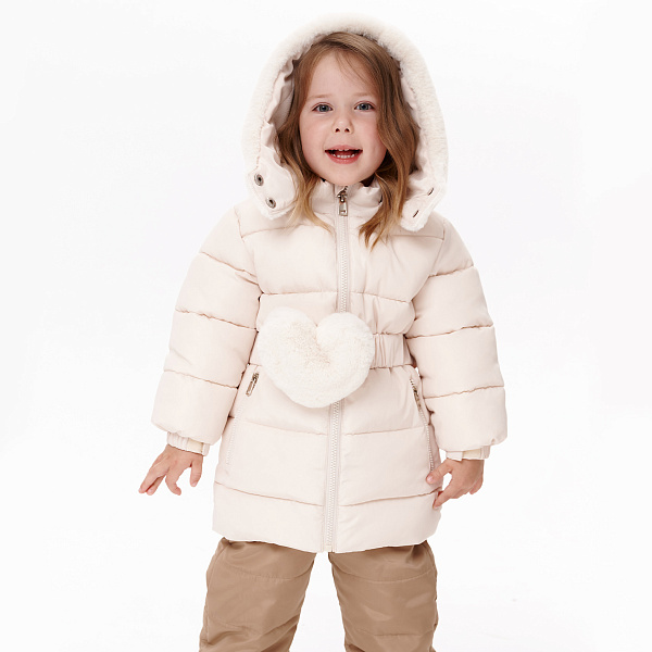 Поясок с резинкой в области талии создает женственный силуэт и защищает от проникновения холода под куртку. Декоративный элемент в виде пушистого сердечка не только украшает куртку, но и греет ручки малышки.
