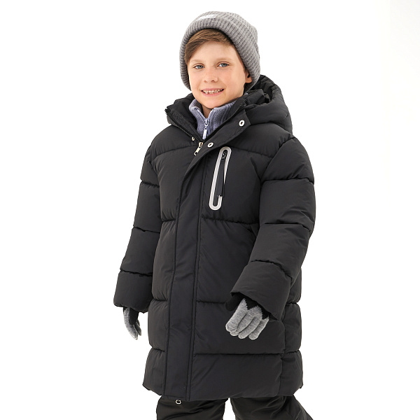Куртка изготовлена из полиэстера, который отвечает за водонепроницаемость и ветронепроницаемость, надежно защищая от неблагоприятных погодных условий. Наполнитель и подкладка, также выполненные из полиэстера, что обеспечивает превосходную теплоизоляцию и сохраняет комфортную температуру тела ребенка даже при морозах до -25°C. При этом материал легкий и не стесняет движений.