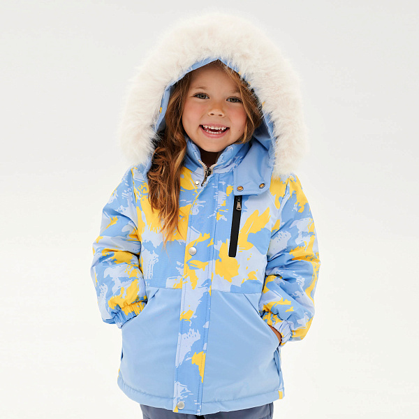 Зимняя детская куртка выполнена в светло-голубом цвете с ярким жёлтым абстрактным принтом, который делает её эффектной и заметной в зимнюю пору. Модель дополнена капюшоном с белой пушистой меховой отделкой, а продуманная посадка и эластичные манжеты обеспечивают комфорт и тепло. Наличие удобных карманов и застёжки на молнию с дополнительной планкой защищают от ветра и холода, придавая куртке практичность и стиль.