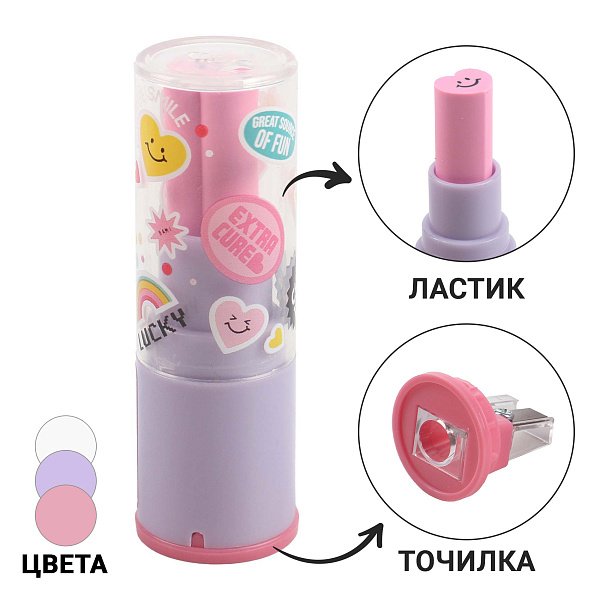 Главная особенность этого ластика — его форма, напоминающая губную помаду. Благодаря такой конструкции ластик легко выкручивается и укручивается обратно, как настоящая помада. Ластик справляется с ошибками в карандашных записях, не оставляя пятен. Его компактный размер позволяет носить его в пенале или кармане рюкзака, сохранив место для других школьных принадлежностей. Встроенная точилка добавляет еще одну важную функцию для школьных будней. С таким канцелярским инструментом школьник решит сразу две проблемы – исправит ошибки в записях и заточит карандаши.
