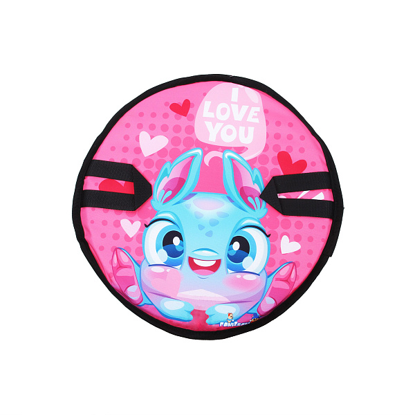 Ледянка имеет круглую форму, две матерчатые ручки по бокам, за которые можно держаться во время спуска. Верхняя сторона украшена разноцветным принтом – симпатичным веселым зайчиком на розовом фоне. Низ однотонный.