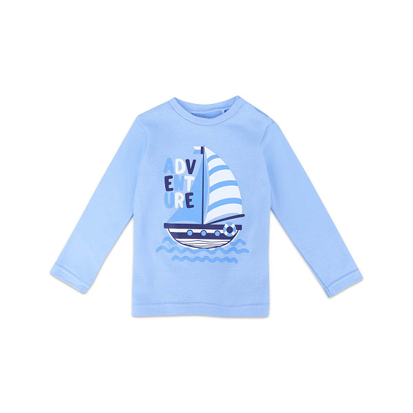 Трикотажный лонгслив с кнопками на плече надевается через голову и доставляет комфорт во время носки. Прелесть такого лонгслива в отсутствии лишних кнопок и застежек – ткань мягко окутывает малыша, не раздражая, не расстегиваясь. Две кнопки на плече позволяют регулировать обхват горловины и облегчают процесс надевания/снятия этого предмета гардероба. Лонгслив сшит из плотной голубой ткани и украшен большим рисунком парусной лодки, плывущей по волнам. Есть надпись на английском «Приключение».