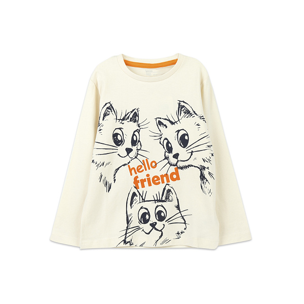 Лонгслив свободного кроя пошит из мягкой и приятной на ощупь ткани на основе хлопка и эластана. Материалы повышают упругость и эластичность ткани, а также хорошо пропускают воздух, благодаря ним лонгслив комфортен в носке. Крой кофты свободный и не сковывает движения, а длинные рукава защитят руки от холодного ветра. Вырез горловины круглый, воротника нет. Перед бежевой кофты дополнен забавным принтом с тремя котятами и оранжевой надписью «Привет, друг». Рекомендовано для детей ясельного возраста.