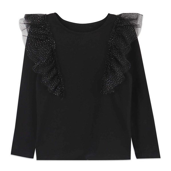 Хлопковый лонгслив с воздушными рюшами подойдет как для повседневной жизни, так и для особых случаев. Легкие черные «крылышки» с мелкими блестками создают праздничной настроение.
