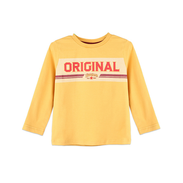 Симпатичный нарядный лонгслив для мальчика младшего возраста сшит из натуральной хлопковой ткани. Он идеален как для уличных прогулок и игр, так и для домашнего использования. Цвет ткани насыщенный светло-коричневый, на груди имеется принт с надписью крупными красными буквами «original». У лонгслива традиционный прямой крой, свободный силуэт, длинные втачные рукава, круглая горловина без воротника и застежек. Такая одежда лучше всего сочетается с синими джинсами, брючками бежевого цвета или других светлых тонов.