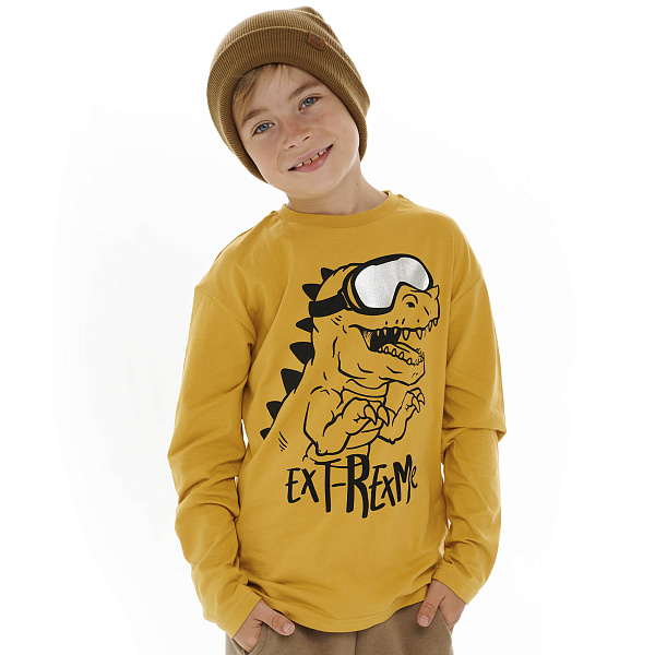 У кофты традиционный для изделий такого типа прямой покрой, длинные рукава и круглая горловина, отстроченная трикотажной резинкой для удобства надевания. На груди имеется забавный принт – изображение динозавра в горнолыжных очках. Хорошо сочетается с брюками, джинсами или шортами.