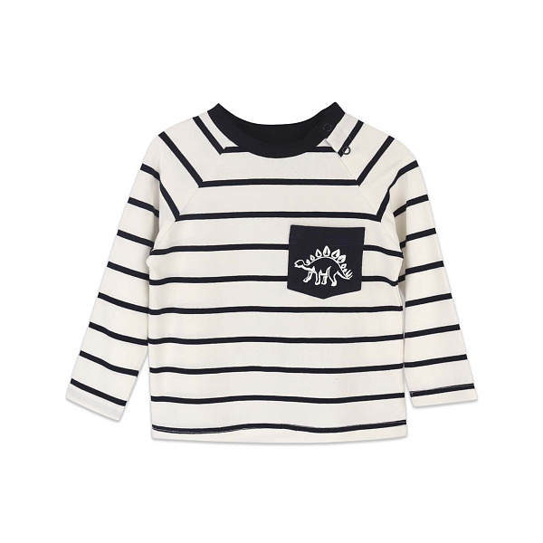 Универсальная кофточка для мальчика на каждый день. Изделие выполнено в белом цвете с поперечными черными полосками. Оно имеет удлиненные рукава, круглую горловину, отделано тесьмой с двумя кнопками-застежками. На левой стороне груди имеется принт с изображением динозавра. Изделие имеет свободный крой, не стесняет движений, является удобным и гигиеничным.