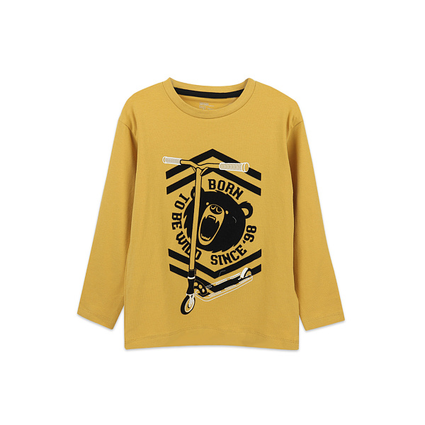 Горчичного цвета лонгслив добавит акцента и яркости в детский гардероб. Ткань кофты пошита из комбинации натурального хлопка и эластана, материалы обеспечивают хороший обмен воздуха, эластичность ткани и приятное прилегание к телу. Свободный крой не сковывает движения, а длинные рукава защитят руки ребенка от холодного воздуха. Вырез горловины круглый, воротника нет. Передняя сторона украшена стильным уличным принтом с головой медведя и самокатом. Рекомендовано для детей дошкольного и школьного возраста.