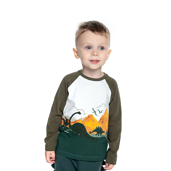 Лонгслив с принтом динозавром понравится каждому любителю доисторических ящеров. Кофта изготовлена из натурального хлопка, материал приятно прилегает к телу, обеспечивает естественную вентиляцию и обеспечивает комфорт в носке. Свободный крой не сковывает движения, а длинные рукава защитят руки от холодного ветра. Вырез горловины круглый, обработан окантовкой цвета хаки, в тон к рукавам. Передняя сторона кофты украшена красочным принтом с изображением доисторических ящеров на фоне гор. Рекомендовано для детей ясельного возраста.