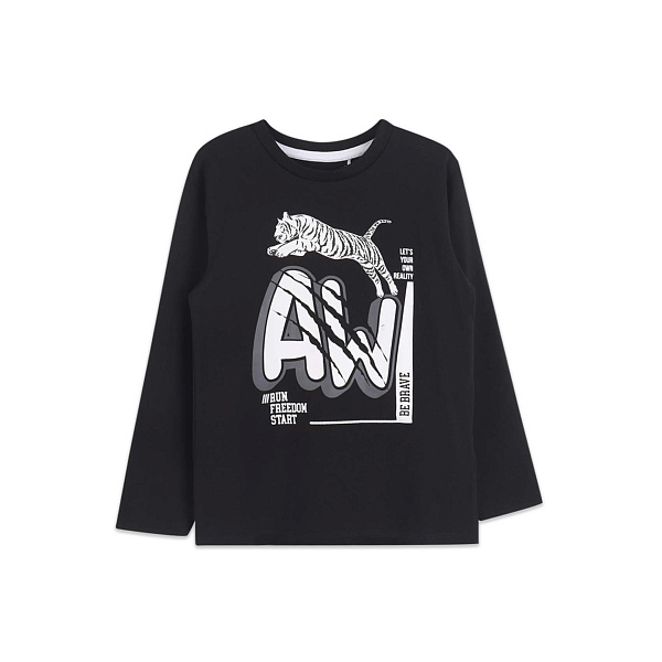 Практичная и удобная фуфайка с длинным рукавом для мальчиков. Изготовлена из натуральной хлопковой ткани с примесью эластана. Материал плотный, дышащий, обладающий хорошими показателями износостойкости. Модель выполнена в черном цвете с белой картинкой на груди. Крой свободный, со спущенной линией плеч. Кофта выглядит современно и обязательно понравится маленьким модникам.