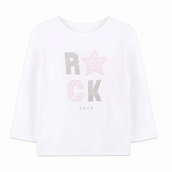 Лонгслив для девочек в белом цвете с надписью «ROCK STAR» выполнен в стильном дизайне с блестящими элементами. Изготовлен из мягкой и приятной на ощупь ткани, обеспечивающей комфорт и свободу движений. Принт с блестками и розовыми деталями придает изделию яркий и модный вид, который обязательно понравится маленьким модницам.