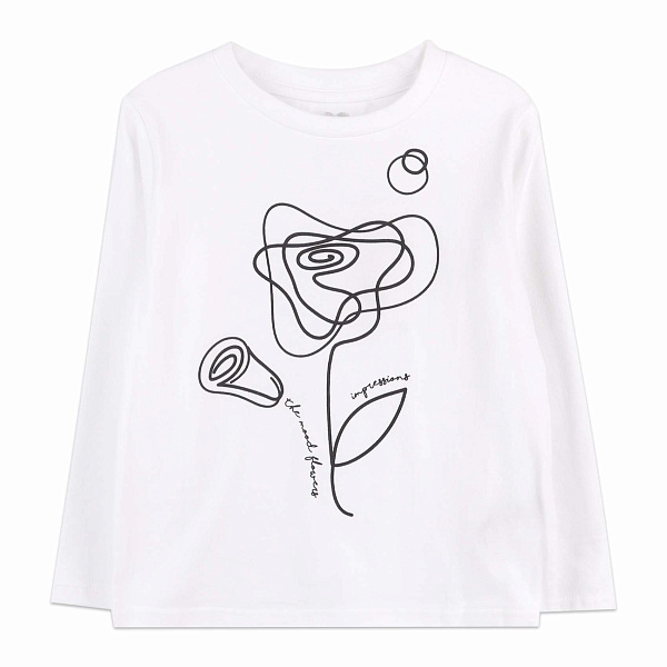 Лонгслив для девочек в белом цвете украшен изящным черным рисунком в виде абстрактного цветка. Модель выполнена из мягкой и приятной на ощупь ткани, которая обеспечивает комфорт в течение дня. Принт придает изделию стильный и современный вид, подходящий для повседневной носки и особых случаев.