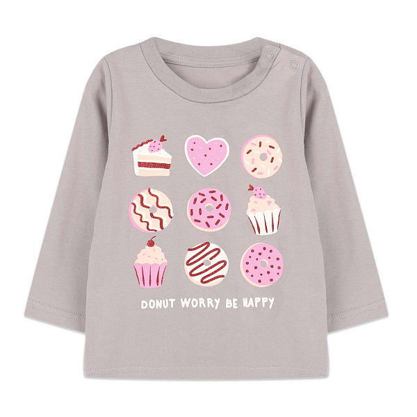 Лонгслив для девочек выполнен из мягкого и приятного на ощупь материала серого цвета. На передней части изделия красуется яркий и забавный принт с изображениями пончиков, капкейков и тортика в розовых и красных тонах. Длинные рукава и круглый вырез горловины обеспечивают комфорт и свободу движений.