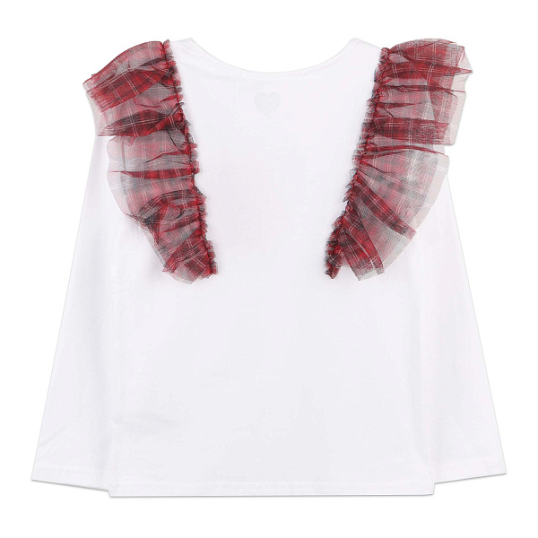 Белый детский лонгслив из хлопка — это сочетание комфорта и праздничного настроения. Универсальный белый цвет позволяет лонгсливу гармонично вписываться как в повседневный гардероб, так и в нарядные образы. Главный акцент — воздушные рюши на плечах. Они выполнены из легкой ткани с красной клеткой, которая добавляет изделию элегантности и очарования.