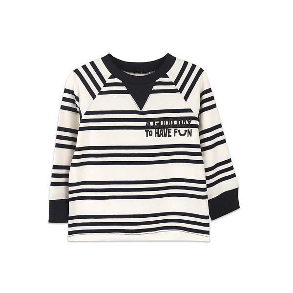 В теплую погоду мальчик младшего возраста может проводить на улице много времени в удобной и гигиеничной кофточке. Она имеет прямой покрой, круглый вырез горловины и длинные рукава. Оригинальное оформление – по белому полю идут поперечные черные полосы, манжеты рукавов и ворот выполнены в черном цвете. От горловины к груди опускается V-образный черный элемент декора в виде опрокинутого треугольника. На груди имеется принт в виде текста A good day to have fun (хороший день для веселья).