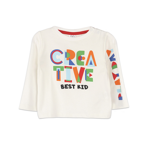 Нарядная кофточка с длинным рукавом станет топовой деталью гардероба мальчика. Изделие имеет круглую горловину, отстроченную трикотажной резинкой. Кофточка в белом цвете декорирована на груди и рукавах надписью крупными разноцветными буквами Creative best kid (лучший креативный ребенок). Изделия имеет прямой силуэт, хорошо сочетается практически с любым видом одежды, хорошо сидит.
