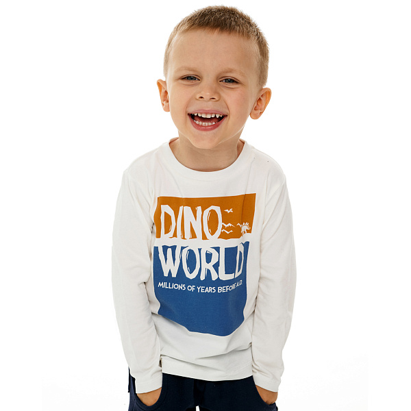Кофточка классического прямого покроя с длинными рукавами и круглой горловиной. Изделие имеет белый цвет, на передней части - большой разноцветный принт с надписью «Dino world. Millions of years before A.D. (Мир динозавров. Миллионы лет до нашей эры). Может использоваться в качестве верхней одежды в теплое время года или в качестве нижнего слоя под демисезонную одежду.