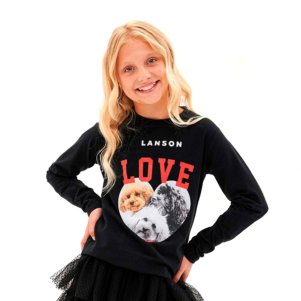 Лонгслив для девочки выполнен в насыщенном черном цвете, который выглядит стильно и современно. Спереди — крупный яркий принт с изображением трех забавных собачек внутри сердца и нежной надписью «LOVE».