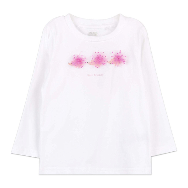Лонгслива украшен изображением трех ежиков розового цвета, которые задают настроение всему образу. Белый базовый цвет легко сочетается с любыми другими предметами гардероба, будь то джинсы, юбки и сарафаны.