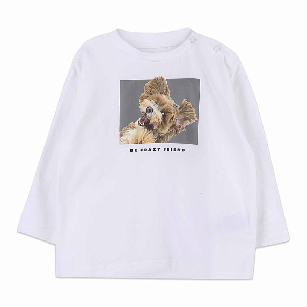 Модель представлена в классическом белом цвете с ярким принтом в виде забавной собачки и надписью «Be Crazy Friend». Этот дизайн добавляет изделию задора и делает его особенно привлекательным для юных модниц.