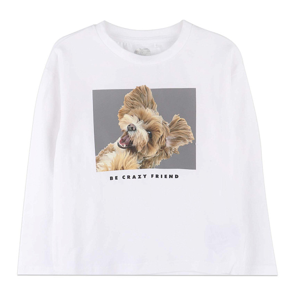 Лонгслив для девочек выполнен в универсальном белом цвете и украшен ярким принтом с изображением забавного щенка. Надпись «Be Crazy Friend» добавляет веселый акцент, подчеркивая жизнерадостный характер изделия.