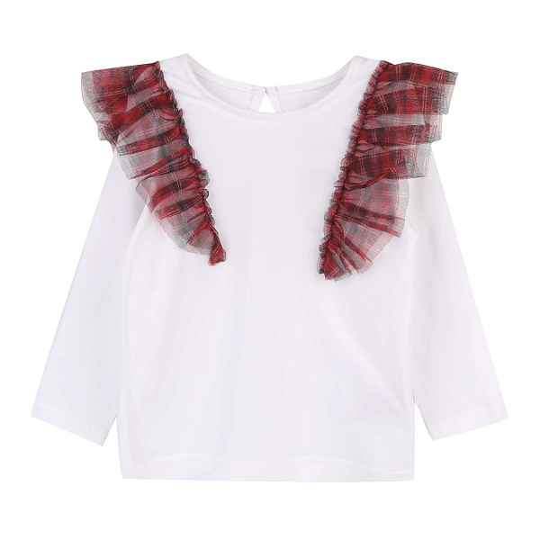 Особенностью этого лонгслива является изысканный дизайн — на плечах расположены объемные рюши из ткани в клетку, которые придают изделию праздничный вид. Белоснежный оттенок материала гармонично сочетается с контрастными рюшами. Прямой крой и длинные рукава обеспечивают свободу движений, что особенно важно для активного дня.