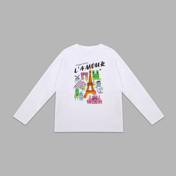 Яркий лонгслив для девочки с длинными рукавами и стильным принтом, который оживит любой образ. Белый цвет делает вещь универсальной и легкой в сочетании с другими элементами одежды, а красочный рисунок с изображением парижских достопримечательностей вдохновляет на новые приключения.